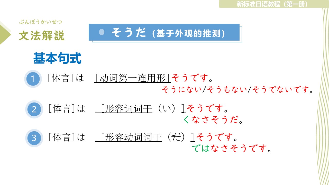 外观推测 看起来〜样 幸せそう 看起来幸福 幸せてはなさそう 看起来不幸福 いいてす→よさそう 动词接ます型 そうです / そうにないです 传闻 动词终止形 + そうだ 雨が降るそうです。 形容词终止形 + そうだ ケーキはおいしいそうです。 形容动词终止形 + そうだ あの二人は幸せだそうです。 名词 + だ + そうだ 明日は休みだそうです。